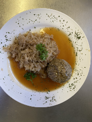 - 2 Wildschweinleberknödel mit Kraut & Brot